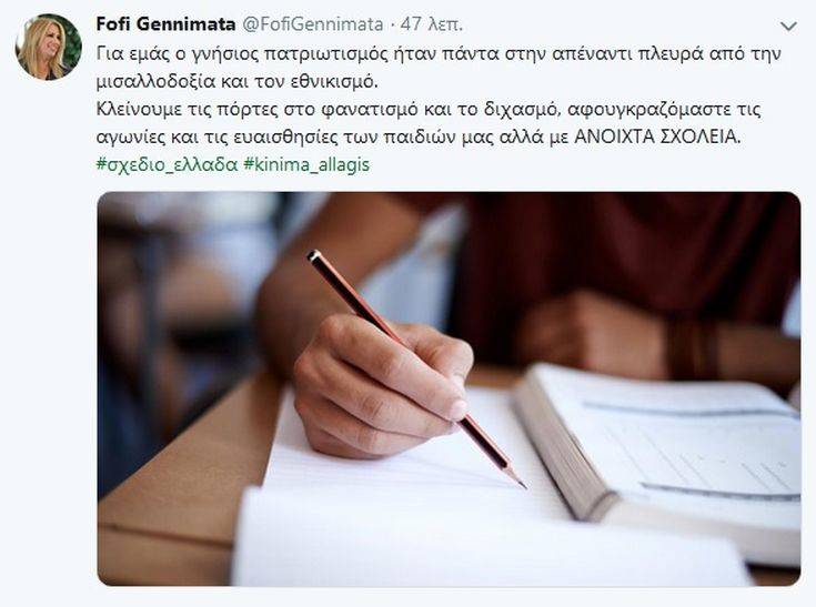 «Για εμάς ο γνήσιος πατριωτισμός ήταν πάντα στην απέναντι πλευρά από τη μισαλλοδοξία και τον εθνικισμό. Κλείνουμε τις πόρτες στον φανατισμό και τον διχασμό, αφουγκραζόμαστε τις αγωνίες και τις ευαισθησίες των παιδιών μας, αλλά με ΑΝΟΙΧΤΑ ΣΧΟΛΕΙΑ» έγραψε η πρόεδρος του Κινήματος Αλλαγής.