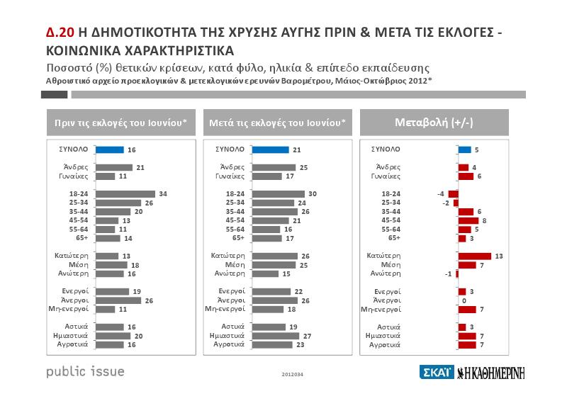 Επίσης η Χρυσή Αυγή εμφανίζει αύξηση και στις γυναίκες (+6%) αν και οι υποστηρικτές της εξακολουθούν να είναι κυρίως νέοι και άνδρες, στους οποίους έχει δημοτικότητα 25%.