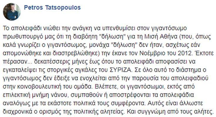 Μέσω facebook απάντησε με σκληρό τρόπο στον Α. Τσίπρα ο συγγραφέας Πέτρος Τατσόπουλος αναφέροντας: