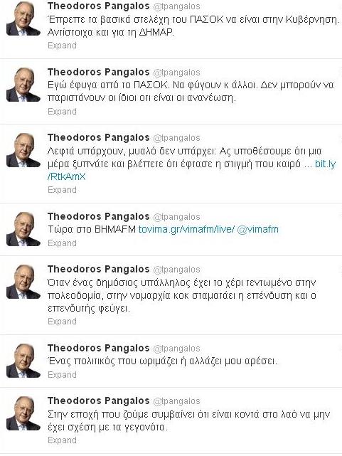 Το δικό του παράδειγμα, που αποχώρησε, θα έπρεπε να ακολουθήσουν κι άλλα στελέχη του ΠΑΣΟΚ όπως έγραψε ο Θεόδωρος Πάγκαλος στο λογαριασμό του στο twitter, αφού μόνο έτσι, όπως αναφέρει, θα έρθει η ανανέωση της παράταξης.