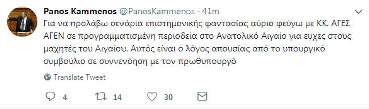 Απών από το αυριανό υπουργικό συμβούλιο θα είναι ο υπουργός Άμυνας Πάνος Καμμένος, όπως γνωστοποίησε μέσω Twitter για να προλάβει «σενάρια επιστημονικής φαντασίας», όπως σχολιάζει.