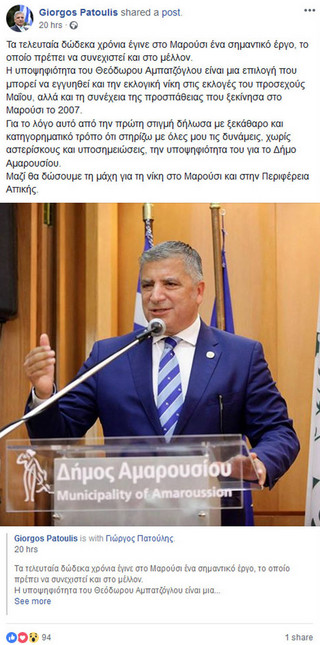 Υπενθυμίζεται ότι μετά τις πληροφορίες που έφεραν την Μαρίνα Πατούλη να καταθέτει υποψηφιότητα για τον Δήμο Αμαρουσίου, ο νυν Δήμαρχος και πρόεδρος της ΚΕΔΕ Γιώργος Πατούλης ξεκαθάρισε ότι ο ίδιος στηρίζει την υποψηφιότητα του Θ. Αμπατζόγλου.