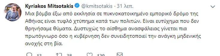 Ο πρόεδρος της ΝΔ τονίζει πως «μια βόμβα έξω από εκκλησία σε πυκνοκατοικημένο εμπορικό δρόμο της Αθήνας είναι τυφλό χτύπημα κατά των πολιτών» προσθέτοντας πως «είναι ευτύχημα που δεν θρηνήσαμε θύματα.