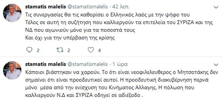 «Κάποιοι βιάστηκαν να χαρούν. Το ότι είναι νεοφιλελεύθερος ο Μητσοτάκης δεν σημαίνει ότι είναι προοδευτικοί αυτοί» αναφέρει σε tweet του ο γραμματέας επικοινωνίας τους ΚΙΝΑΛ Σταμάτης Μαλέλης, στον απόηχο των χθεσινών του δηλώσεων.