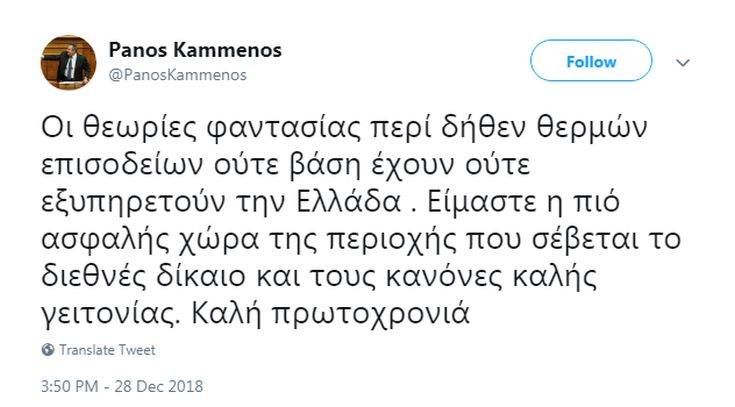 Σε ανάρτησή του στο Twitter, αναφερόμενος προφανώς στις δηλώσεις του Παναγιώτη Σγουρίδη (χωρίς να τον κατονομάζει), ο πρόεδρος των ΑΝΕΛ και υπουργός Άμυνας Πάνος Καμμένος σχολίασε: «Οι θεωρίες φαντασίας περί δήθεν θερμών επεισοδίων ούτε βάση έχουν ούτε εξυπηρετούν την Ελλάδα. Είμαστε η πιο ασφαλής χώρα της περιοχής που σέβεται το διεθνές δίκαιο και τους κανόνες καλής γειτονίας. Καλή πρωτοχρονιά».