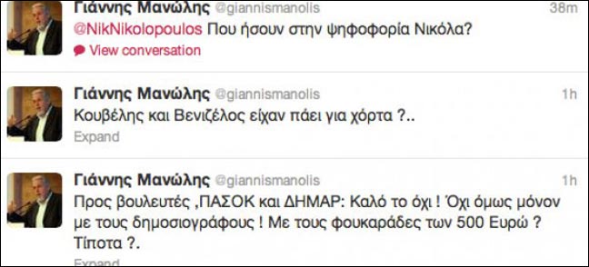 «Προς βουλευτές ΠΑΣΟΚ και ΔΗΜΑΡ: Καλό το όχι! Όχι όμως μόνον με τους δημοσιογράφους! Με τους φουκαράδες των 500 ευρώ; Τίποτα;», τουίταρε επίσης.