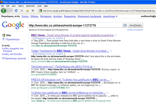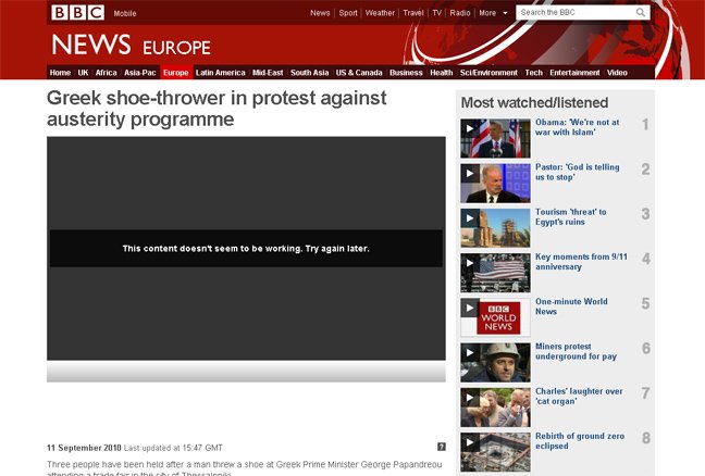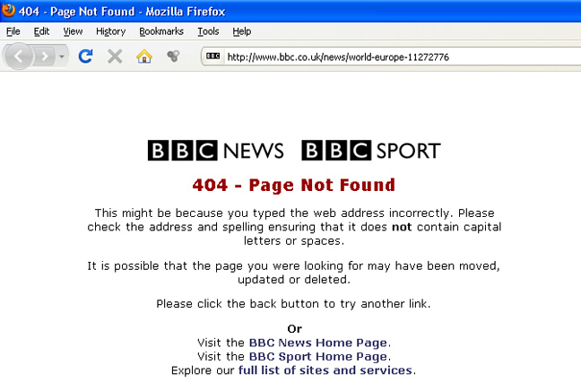 Εάν κάποιος σήμερα προσπαθήσει να αναζητήσει το σχετικό άρθρο http://www.bbc.co.uk/news/world-europe-11272776 στη σελίδα του BBC τότε θα δει το ακόλουθο screenshot.