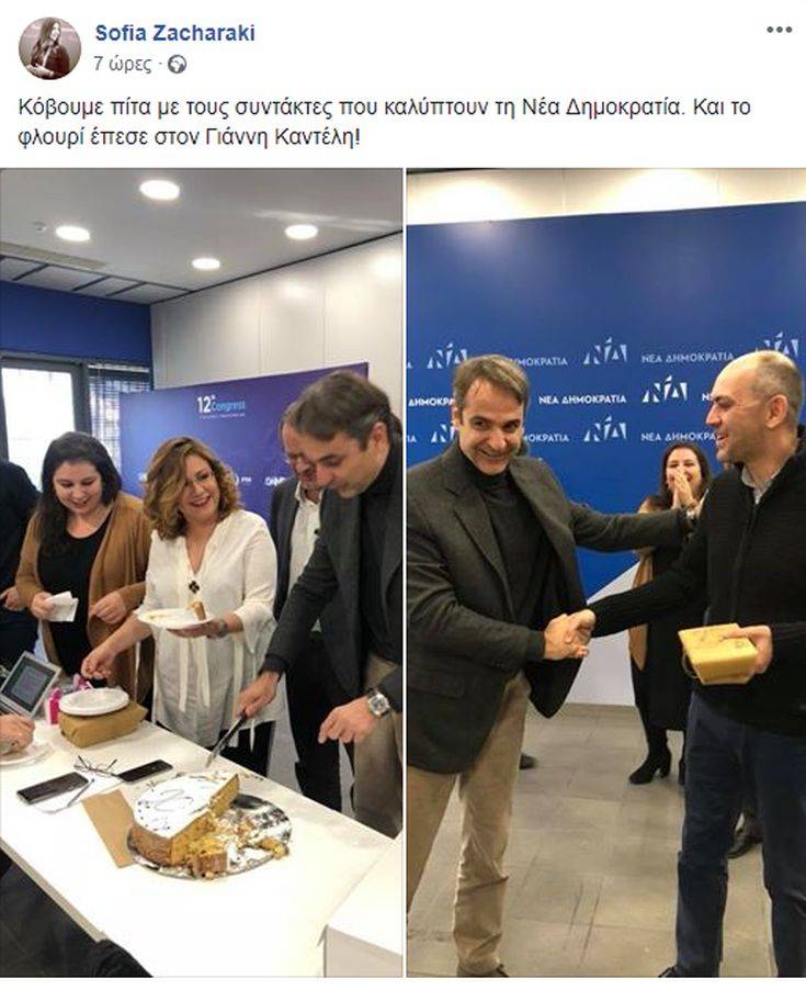 Τη βασιλόπιτα των πολιτικών συντακτών που καλύπτουν το ρεπορτάζ της Νέας Δημοκρατίας έκοψε το μεσημέρι, μετά από το καθιερωμένο briefing, η εκπρόσωπος Τύπου του κόμματος, Μαρία Σπυράκη, παρουσία του προέδρου της Νέας Δημοκρατίας Κυριάκου Μητσοτάκη.