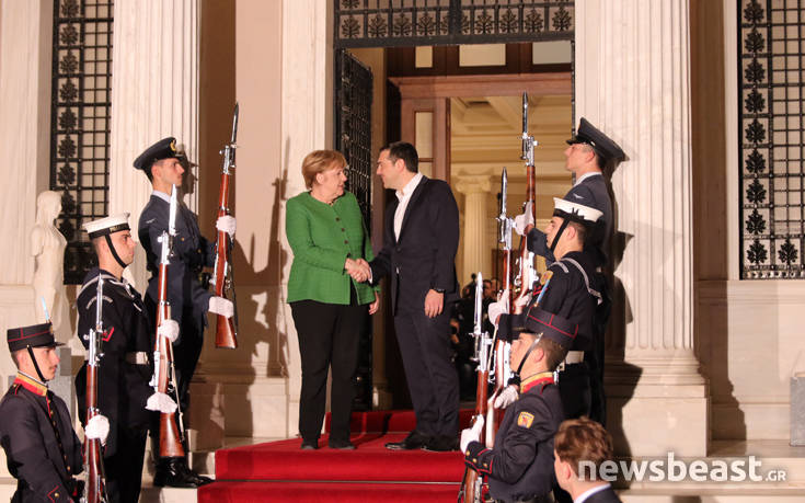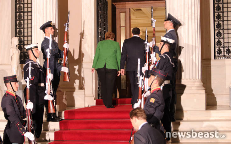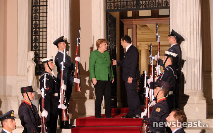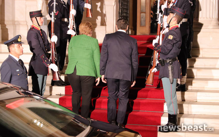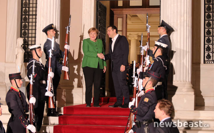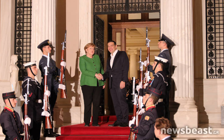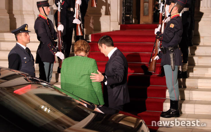 Στο Μέγαρο Μαξίμου υποδέχτηκε ο πρωθυπουργός Αλέξης Τσίπρας την καγκελάριο της Γερμανίας Άνγκελα Μέρκελ, η οποία έφτασε στην Αθήνα το απόγευμα της Πέμπτης.