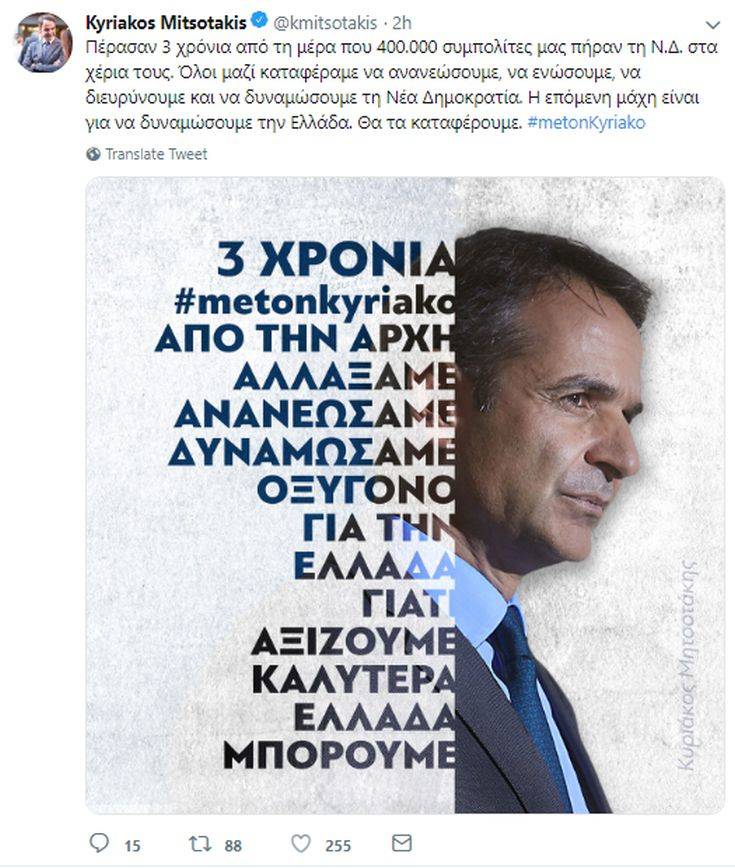 «Πέρασαν 3 χρόνια από τη μέρα που 400.000 συμπολίτες μας πήραν τη Ν.Δ. στα χέρια τους. Όλοι μαζί καταφέραμε να ανανεώσουμε, να ενώσουμε, να διευρύνουμε και να δυναμώσουμε τη Νέα Δημοκρατία. Η επόμενη μάχη είναι για να δυναμώσουμε την Ελλάδα. Θα τα καταφέρουμε. #metonΚyriako», έγραψε στον λογαριασμό του στο Twitter ο πρόεδρος της Νέας Δημοκρατίας.