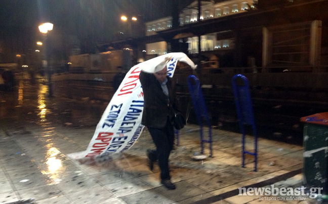 Ένας διαδηλωτής προσπαθεί να προστατευτεί από την καταρρακτώδη βροχή που πέφτει στην Αθήνα, μετά την ολοκλήρωση της ογκώδους διαδήλωσης που πραγματοποιήθηκε ενάντια στα μέτρα λιτότητας σήμερα στην πρωτεύουσα.