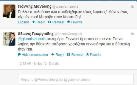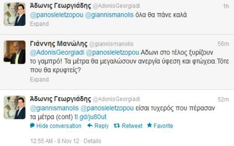 Μάλιστα η κόντρα συνεχίστηκε με το στέλεχος τον Ανεξαρτήτων Ελλήνων να γράφει: «Άδωνι στο τέλος ξυρίζουν το γαμπρό! Τα μέτρα θα μεγαλώσουν ανεργία ύφεση και φτώχεια. Τότε που θα κρυφτείς; Άδωνι θα σε κάνει υπουργό ο Σαμαράς η θα σε πουλήσει? Ξέρεις το συνηθίζει! και τότε? Τζάμπα αγώνας για ναι».
