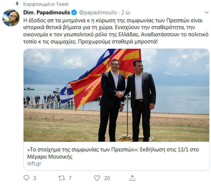 «Η έξοδος από τα μνημόνια και η κύρωση της συμφωνίας των Πρεσπών είναι ιστορικά θετικά βήματα για τη χώρα. Ενισχύουν την σταθερότητα, την οικονομία και τον γεωπολιτικό ρόλο της Ελλάδας. Αναδιατάσσουν το πολιτικό τοπίο και τις συμμαχίες. Προχωρούμε σταθερά μπροστά!».