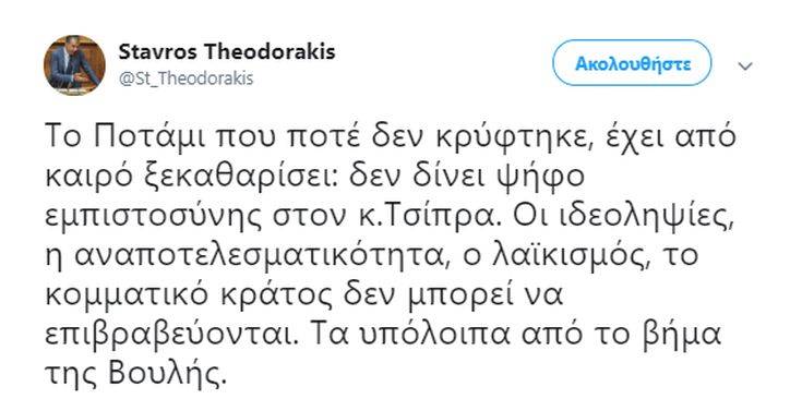 «Το Ποτάμι που ποτέ δεν κρύφτηκε, έχει από καιρό ξεκαθαρίσει: δεν δίνει ψήφο εμπιστοσύνης στον κ. Τσίπρα. Οι ιδεοληψίες, η αναποτελεσματικότητα, ο λαϊκισμός, το κομματικό κράτος δεν μπορεί να επιβραβεύονται. Τα υπόλοιπα από το βήμα της Βουλής», είναι η σχετική ανάρτηση στον Twitter.