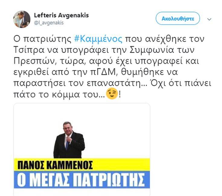 Ο κ. Αυγενάκης προχώρησε και σε δεύτερο «χτύπημα» μέσω social media, με τον ίδιο να τονίζει: «Ο πατριώτης Καμμένος που ανέχθηκε τον Τσίπρα να υπογράφει την Συμφωνία των Πρεσπών, τώρα, αφού έχει υπογραφεί και εγκριθεί από την πΓΔΜ, θυμήθηκε να παραστήσει τον επαναστάτη… Όχι ότι πιάνει πάτο το κόμμα του…!».