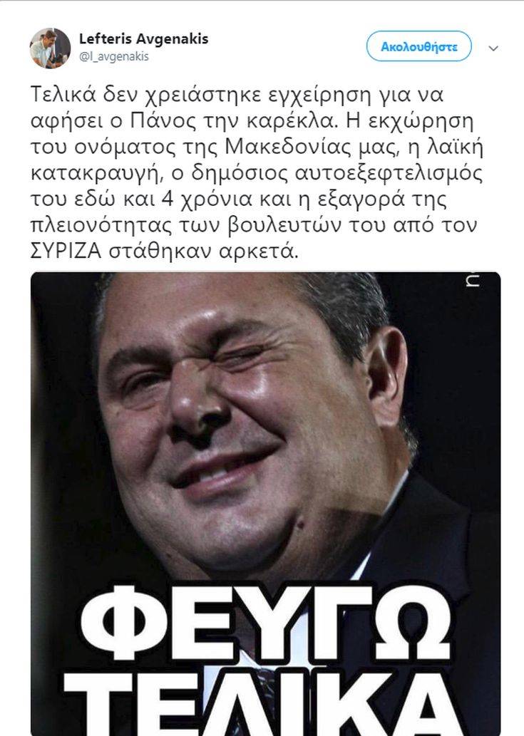 «Τελικά δεν χρειάστηκε εγχείρηση για να αφήσει ο Πάνος την καρέκλα. Η εκχώρηση του ονόματος της Μακεδονίας μας, η λαϊκή κατακραυγή, ο δημόσιος αυτοεξεφτελισμός του εδώ και 4 χρόνια και η εξαγορά της πλειονότητας των βουλευτών του από τον ΣΥΡΙΖΑ στάθηκαν αρκετά», ανέφερε χαρακτηριστικά μέσω ανάρτησης στον λογαριασμό του στο Twitter.