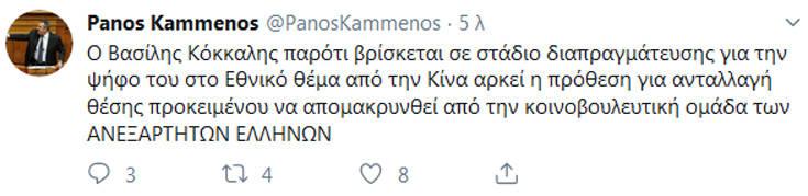 «Ο Βασίλης Κόκκαλης παρότι βρίσκεται σε στάδιο διαπραγμάτευσης για την ψήφο του στο Εθνικό θέμα από την Κίνα αρκεί η πρόθεση για ανταλλαγή θέσης προκειμένου να απομακρυνθεί από την κοινοβουλευτική ομάδα των Ανεξάρτητων Ελλήνων», ανακοίνωσε ο Πάνος Καμμένος μέσω Twitter.