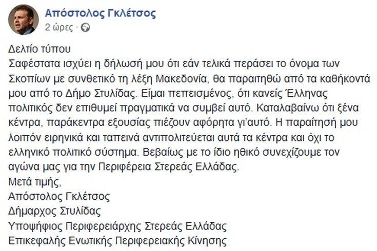 Την πρόθεσή του να παραιτηθεί από τη θέση του δημάρχου Στυλίδας αν εμπεριέχεται ο όρος Μακεδονία στο όνομα των Σκοπίων εξέφρασε ο δήμαρχος Στυλίδας Απόστολος Γκλέτσος.