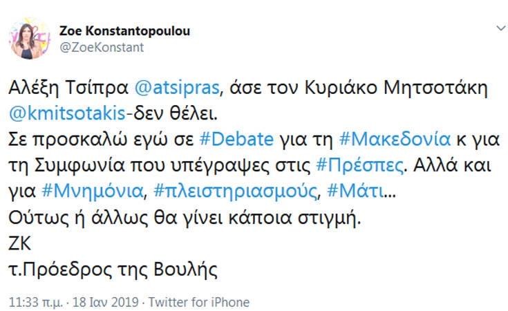 «Αλέξη Τσίπρα, άσε τον Κυριάκο Μητσοτάκη -δεν θέλει. Σε προσκαλώ εγώ σε debate για τη Μακεδονία και για τη Συμφωνία που υπέγραψες στις Πρέσπες. Αλλά και για τα μνημόνια, πλειστηριασμούς, Μάτι» έγραψε στο λογαριασμό της στο twitter.