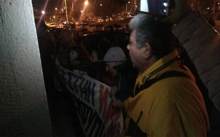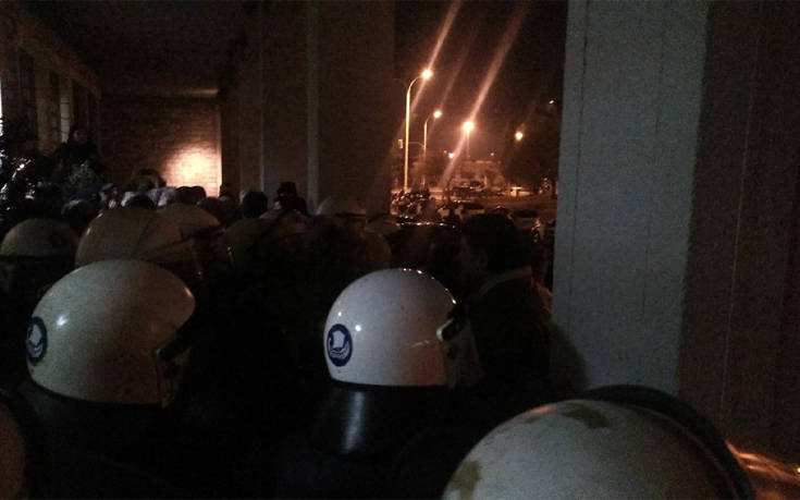 Οι συγκεντρωμένοι φωνάζουν «έξω τα ΜΑΤ», οπαδοί του ΣΥΡΙΖΑ απαντούν με το σύνθημα «έξω οι αλήτες». «Αλήτες είναι τα ΜΑΤ και οι ασφαλίτες», ανταπαντούν οι διαμαρτυρόμενοι.