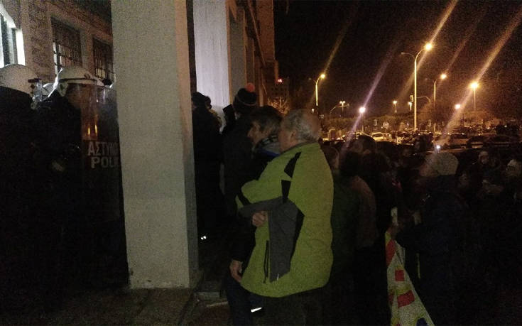 Οι συμμετέχοντες, «πολιορκούν» την κεντρική είσοδο του Δημαρχείου προκειμένου εισέλθουν στο κτίριο αλλά απωθούνται από τις αστυνομικές δυνάμεις και στελέχη του ΣΥΡΙΖΑ τα οποία εμποδίζουν την είσοδό τους.