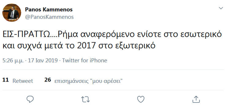 Σημειώνεται πως πρόσφατα ο κ. Καμμένος άφησε βαρύτατους υπαινιγμούς σε βάρος του πρώην υπουργού Εξωτερικών, με ένα tweet του. «ΕΙΣ-ΠΡΑΤΤΩ… Ρήμα αναφερόμενο ενίοτε στο εσωτερικό και συχνά μετά το 2017 στο εξωτερικό», έγραψε στο Twitter ο πρόεδρος των Ανεξαρτήτων Ελλήνων.