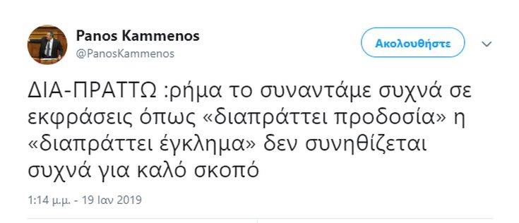Ο κύριος Καμμένος έγραψε το μεσημέρι του Σαββάτου: «ΔΙΑ-ΠΡΑΤΤΩ: ρήμα το συναντάμε συχνά σε εκφράσεις όπως “διαπράττει προδοσία” ή “διαπράττει έγκλημα” δεν συνηθίζεται συχνά για καλό σκοπό».