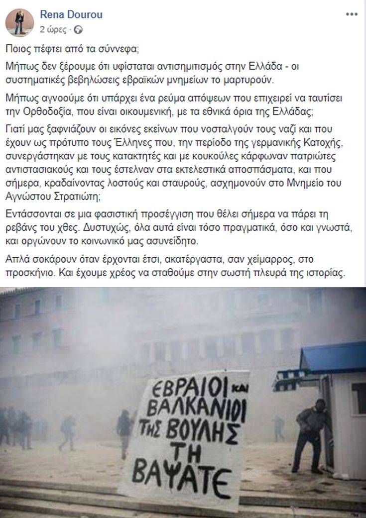 Συγκεκριμένα, η κ. Δούρου αναφέρει: «Ποιος πέφτει από τα σύννεφα; Μήπως δεν ξέρουμε ότι υφίσταται αντισημιτισμός στην Ελλάδα – οι συστηματικές βεβηλώσεις εβραϊκών μνημείων το μαρτυρούν. Μήπως αγνοούμε ότι υπάρχει ένα ρεύμα απόψεων που επιχειρεί να ταυτίσει την Ορθοδοξία, που είναι οικουμενική, με τα εθνικά όρια της Ελλάδας; Γιατί μας ξαφνιάζουν οι εικόνες εκείνων που νοσταλγούν τους ναζί και που έχουν ως πρότυπο τους Έλληνες που, την περίοδο της γερμανικής Κατοχής, συνεργάστηκαν με τους κατακτητές και με κουκούλες κάρφωναν πατριώτες αντιστασιακούς και τους έστελναν στα εκτελεστικά αποσπάσματα, και που σήμερα κραδαίνοντας λοστούς και σταυρούς, ασχημονούν στο Μνημείο του Αγνώστου Στρατιώτη;