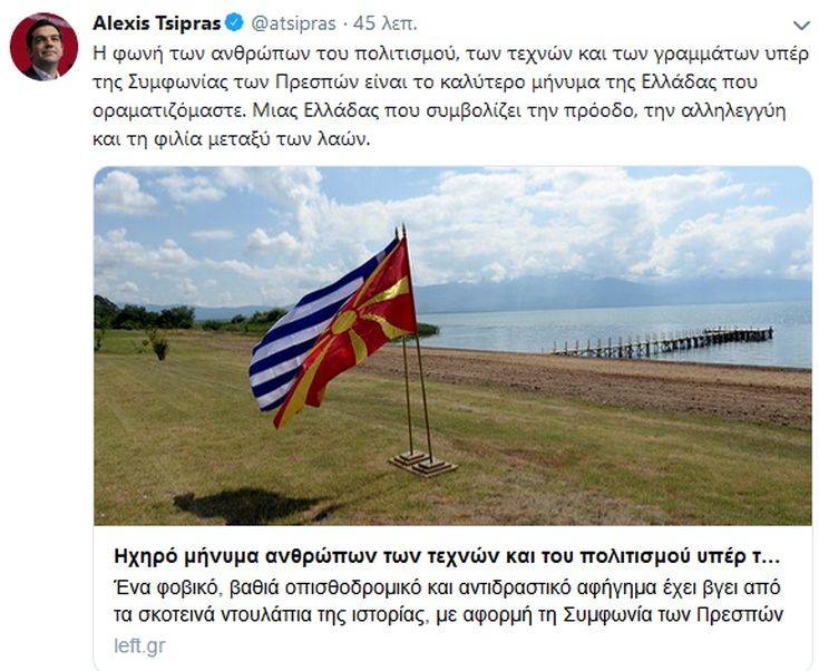 «Η φωνή των ανθρώπων του πολιτισμού, των τεχνών και των γραμμάτων υπέρ της Συμφωνίας των Πρεσπών είναι το καλύτερο μήνυμα της Ελλάδας που οραματιζόμαστε. Μιας Ελλάδας που συμβολίζει την πρόοδο, την αλληλεγγύη και τη φιλία μεταξύ των λαών» αναφέρει σε ανάρτηση του στο twitter ο πρωθυπουργός Αλέξης Τσίπρας.