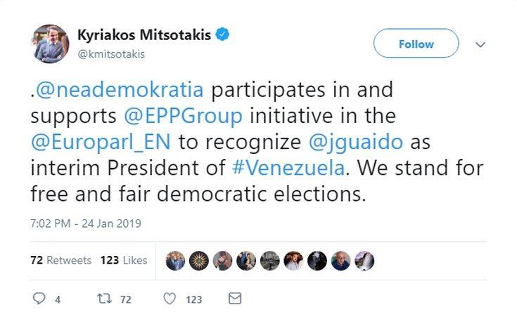 «Η Νέα Δημοκρατία συμμετέχει και υποστηρίζει την πρωτοβουλία του Ευρωπαϊκού Λαϊκού Κόμματος στο Ευρωπαϊκό Κοινοβούλιο για να αναγνωρίσει τον Χουάν Γκουαϊδό ως υπηρεσιακό πρόεδρο της Βενεζουέλας. Στηρίζουμε τις ελεύθερες και δίκαιες δημοκρατικές εκλογές», αναφέρει στην ανάρτησή του ο Κυριάκος Μητσοτάκης.