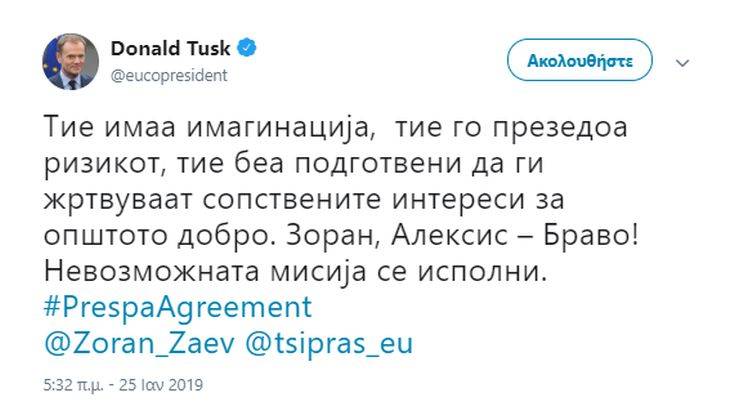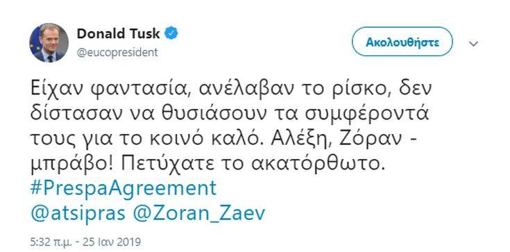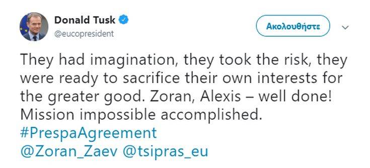 «Είχαν φαντασία, ανέλαβαν το ρίσκο, δεν δίστασαν να θυσιάσουν τα συμφέροντά τους για το κοινό καλό. Αλέξη, Ζόραν – μπράβο! Πετύχατε το ακατόρθωτο» έγραψε στα ελληνικά ο κ. Τουσκ στο Twitter.