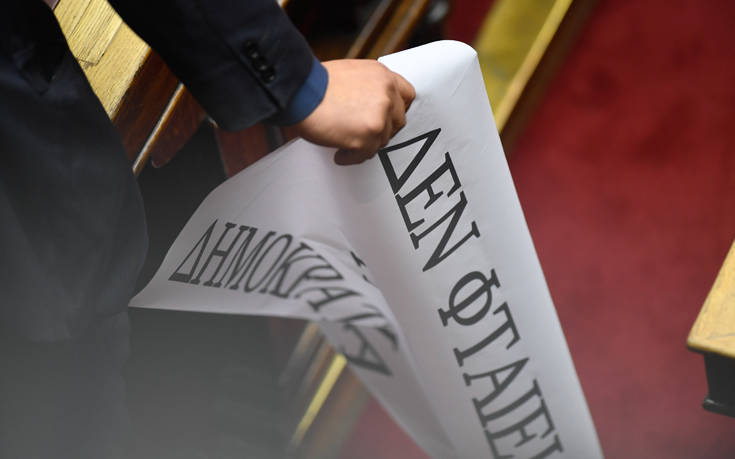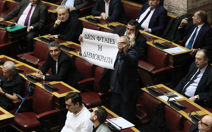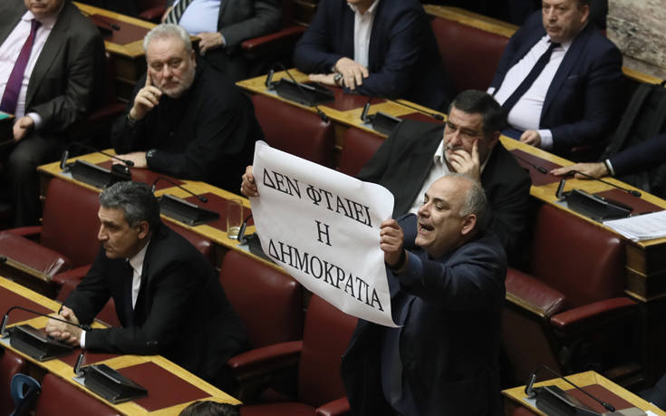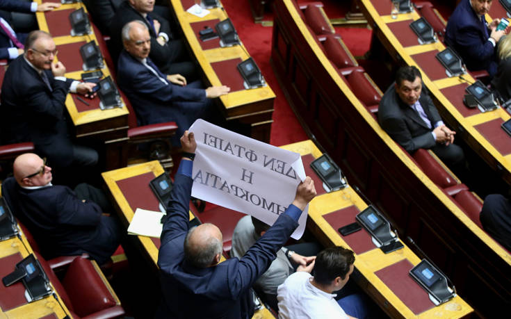 Πλακάτ στην αίθουσα ύψωσε ο βουλευτής της Ένωσης Κεντρώων Γιάννης Σαρίδης, ο οποίος καταψηφίζει τη Συμφωνία των Πρεσπών.