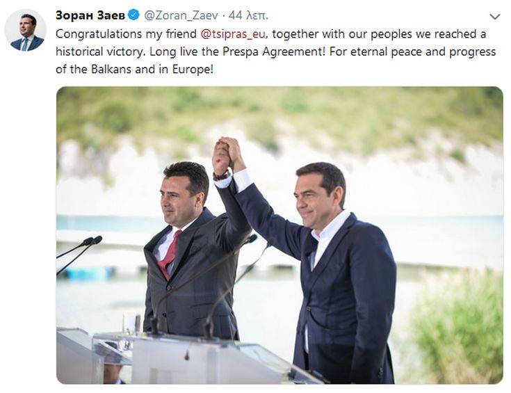 «Συγχαρητήρια, φίλε μου» Αλέξη Τσίπρα, «μαζί με τους λαούς μας κερδίσαμε μια ιστορική νίκη. Ζήτω η συμφωνία των Πρεσπών! Για μια αιώνια ειρήνη και την πρόοδο των Βαλκανίων και στην Ευρώπη», έγραψε στο Twitter ο Ζόραν Ζάεφ.