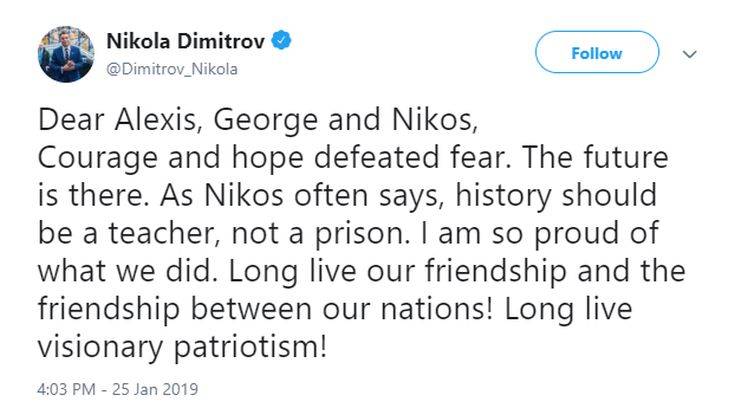 «Το θάρρος και η ελπίδα νίκησαν τον φόβο» αναφέρει σε ανάρτησή του στον προσωπικό του λογαριασμό στο Twitter ο υπουργός Εξωτερικών της ΠΓΔΜ Νίκολα Ντιμιτρόφ, απευθυνόμενος προς τον πρωθυπουργό Αλέξη Τσίπρα, τον αναπληρωτή υπουργό Εξωτερικών Γιώργο Κατρούγκαλο και τον πρώην υπουργό Εξωτερικών Νίκο Κοτζιά.