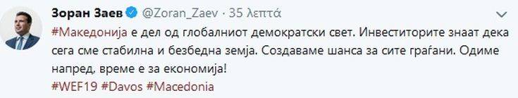 «Οι επενδυτές γνωρίζουν ότι τώρα είμαστε μια σταθερή και ασφαλής χώρα. Δημιουργούμε ευκαιρίες για όλους τους πολίτες. Προχωράμε μπροστά, ήρθε η ώρα για την οικονομία!» έγραψε ο σκοπιανός πρωθυπουργός.