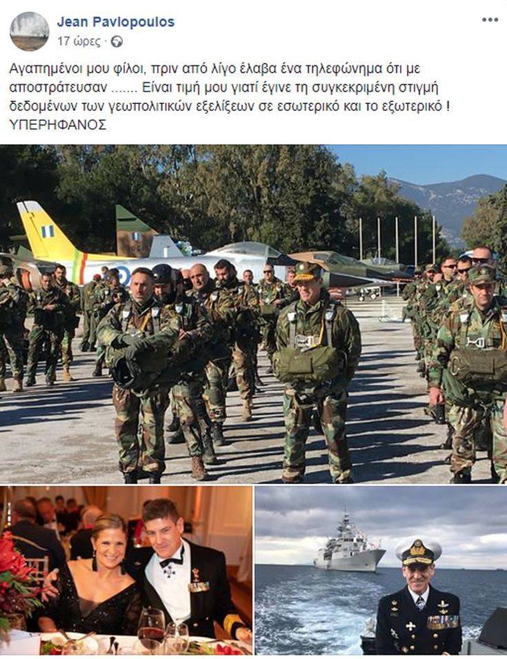 Επιπλέον, ο Αντιναύαρχος Ιωάννης Παυλόπουλος σχολίασε για την αποστράτευσή του τα εξής στο Facebook: «Αγαπημένοι μου φίλοι, πριν από λίγο έλαβα ένα τηλεφώνημα ότι με αποστράτευσαν……. Είναι τιμή μου γιατί έγινε τη συγκεκριμένη στιγμή δεδομένων των γεωπολιτικών εξελίξεων σε εσωτερικό και το εξωτερικό ! ΥΠΕΡΗΦΑΝΟΣ».