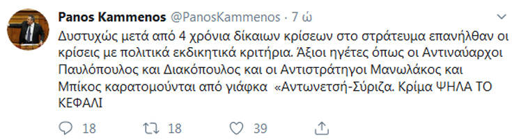 Παρόμοιες καταγγελίες έκανε και ο πρόεδρος των Ανεξάρτητων Ελλήνων Πάνος Καμμένος, ο οποίος έγραψε στο Twitter: «Δυστυχώς μετά από τέσσερα χρόνια δίκαιων κρίσεων στο στράτευμα, επανήλθαν οι κρίσεις με πολιτικά εκδικητικά κριτήρια. Άξιοι ηγέτες όπως οι Αντιναύαρχοι Παυλόπουλος και Διακόπουλος και οι Αντιστράτηγοι Μανωλάκος και Μπίκος καρατομούνται από γιάφκα «Αντωνετσή – ΣΥΡΙΖΑ. Κρίμα. Ψηλά το κεφάλι».