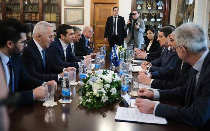 Μετά την κατ΄ιδίαν συνάντηση Αναστασιάδη-Τσίπρα ακολούθησε διευρυμένη σύσκεψη στην οποία συμμετείχαν και οι υπουργοί Άμυνας των δύο χωρών, Σάββας Αγγελίδης και Ευάγγελος Αποστολάκης, ο υπουργός Εξωτερικών της Κύπρου Νίκος Χριστοδουλίδης και υπηρεσιακοί παράγοντες.