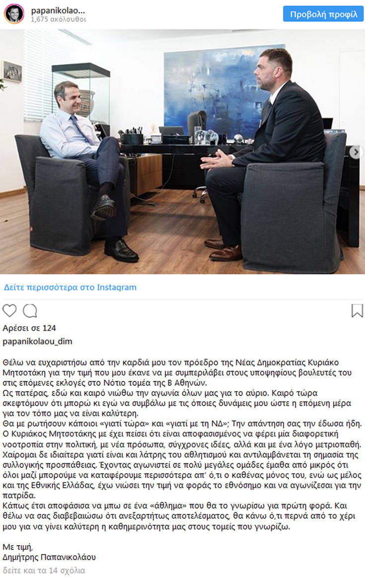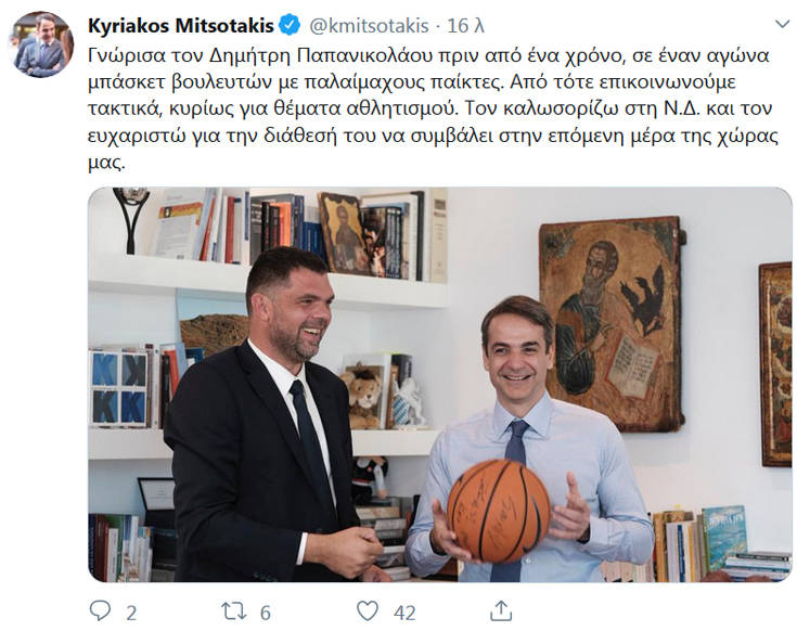 «Γνώρισα τον Δημήτρη Παπανικολάου πριν από έναν χρόνο σε έναν αγώνα μπάσκετ βουλευτών με παλαίμαχους. Από τότε επικοινωνούμε τακτικά, κυρίως για θέματα αθλητισμού. Τον καλωσορίζω στη ΝΔ και τον ευχαριστώ για τη διάθεσή του να συμβάλει στην επόμενη μέρα της χώρας μας», έγραψε πριν από λίγο στον λογαριασμό του στο twitter ο κ. Μητσοτάκης, ανεβάζοντας και μία φωτογραφία του με τον Έλληνα καλαθοσφαιριστή.