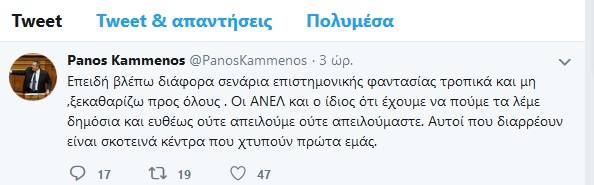 «Επειδή βλέπω διάφορα σενάρια επιστημονικής φαντασίας τροπικά και μη, ξεκαθαρίζω προς όλους. Οι ΑΝΕΛ και ο ίδιος ό,τι έχουμε να πούμε τα λέμε δημόσια και ευθέως ούτε απειλούμε ούτε απειλούμαστε. Αυτοί που διαρρέουν είναι σκοτεινά κέντρα που χτυπούν πρώτα εμάς» αναφέρει ο πρόεδρος των Ανεξάρτητων Ελλήνων, Πάνος Καμμένος σε ανάρτηση στο προσωπικό του λογαριασμό στο Twitter.