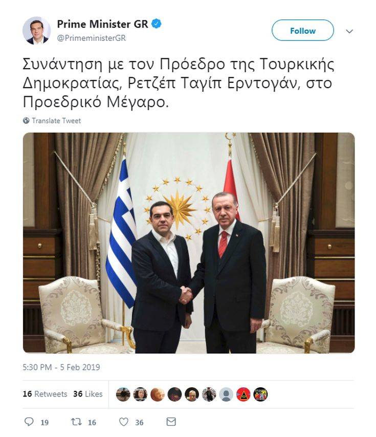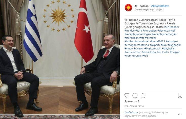 Στις φωτογραφίες που δόθηκαν στη δημοσιότητα από την τουρκική προεδρία φαίνονται οι δύο ηγέτες να κάνουν χειραψία, καθώς και να κάθονται χαμογελώντας στο προεδρικό παλάτι της Άγκυρας.