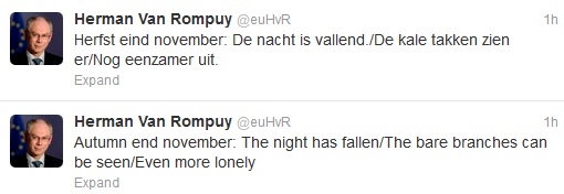 Κι ενώ στις Βρυξέλλες λαμβάνουν χώρα κρίσιμες διαβουλεύσεις που θα κρίνουν την εκταμίευση της επόμενης δόσης προς την Ελλάδα, ο πρόεδρος του Ευρωπαϊκού Συμβουλίου, Χέρμαν Βαν Ρομπάι, ανέβασε ένα νέο ποίημα χαϊκού στο λογαριασμό του στο twitter.