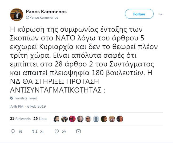 «Η κύρωση της συμφωνίας ένταξης των Σκοπίων στο ΝΑΤΟ λόγω του άρθρου 5 εκχωρεί κυριαρχία και δεν το θεωρεί πλέον τρίτη χώρα. Είναι απόλυτα σαφές ότι εμπίπτει στο 28 άρθρο 2 του Συντάγματος και απαιτεί πλειοψηφία 180 βουλευτών. Η ΝΔ θα στηρίξει πρόταση αντισυνταγματικότητας;» αναφέρει ο Πάνος Καμμένος, σε ανάρτησή του στον προσωπικό του λογαριασμό στο Twitter.