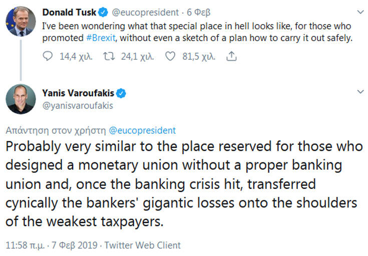 Σήμερα τη σκυτάλη παίρνει ο Γιάννης Βαρουφάκης, ο οποίος συνδυάζει τα του Brexit με τον δικό του τομέα δράσης, τα οικονομικά.