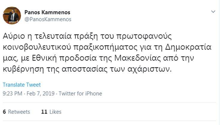 «Αύριο η τελευταία πράξη του πρωτοφανούς κοινοβουλευτικού πραξικοπήματος για τη Δημοκρατία μας, με Εθνική προδοσία της Μακεδονίας από την κυβέρνηση της αποστασίας των αχάριστων», αναφέρει στην ανάρτησή του ο Πάνος Καμμένος.