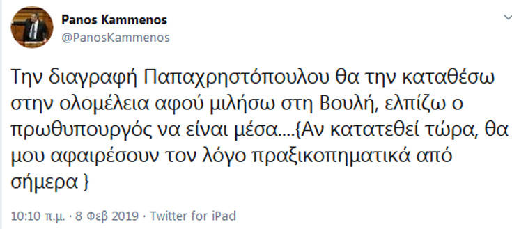 «Τη διαγραφή Παπαχρηστόπουλου θα την καταθέσω στην ολομέλεια αφού μιλήσω στη Βουλή, ελπίζω ο πρωθυπουργός να είναι μέσα….{Αν κατατεθεί τώρα, θα μου αφαιρέσουν τον λόγο πραξικοπηματικά από σήμερα }» έγραψε ο Πάνος Καμμένος.