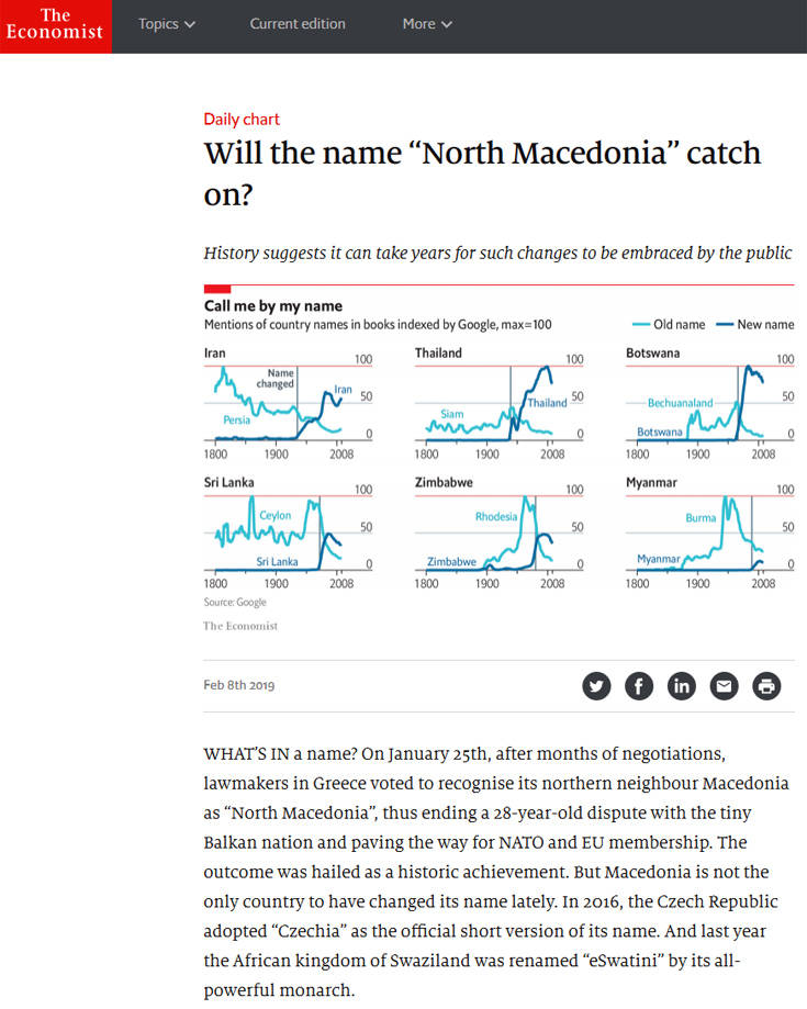 Στο θέμα της αλλαγής της ονομασίας της πΓΔΜ σε Δημοκρατία της Βόρειας Μακεδονίας αναφέρεται δημοσίευμα του Economist, παρουσιάζοντας και άλλα παραδείγματα χωρών, που άλλαξαν όνομα, αλλά σημειώνοντας και το γεγονός πως η αλλαγή στα χαρτιά δεν σημαίνει και άμεση αλλαγής τη χρήση του εκάστοτε ονόματος.