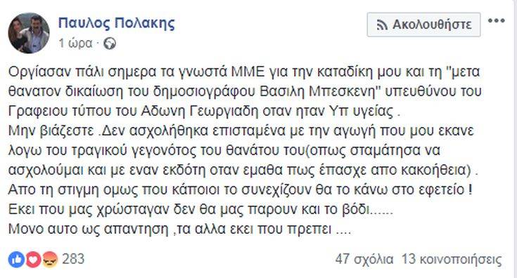 Μέσω Facebook σχολίασε την καταδίκη του από το Πολυμελές Πρωτοδικείο Αθηνών για εξύβριση του δημοσιογράφου Βασίλη Μπεσκένη ο αναπληρωτής υπουργός Υγείας Παύλος Πολάκης, απορρίπτοντας τα περί «μετά θάνατον δικαίωσης» του δημοσιογράφου.