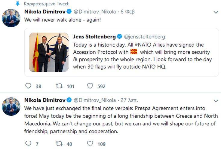 Η ανάρτηση του κ. Ντιμιτρόφ (@dimitrov_nikola) στα αγγλικά έχει ως εξής: «We have just exchanged the final note verbale: Prespa Agreement enters into force! May today be the beginning of a long friendship between Greece and North Macedonia. We can’t change our past, but we can and we will shape our future of friendship, partnership and cooperation».