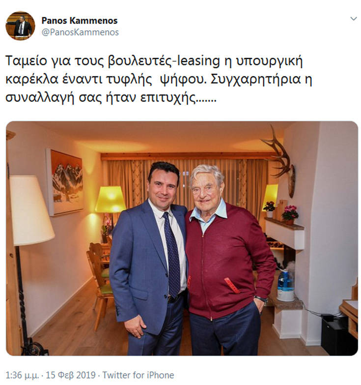 Με tweet και μια φωτογραφία του Σκοπιανού πρωθυπουργού με τον μεγαλοεπενδυτή, Τζορτζ Σόρος στο περιθώριο του Παγκόσμιου Οικονομικού Φόρουμ του Νταβός σχολίασε τον ανασχηματισμό ο πρόεδρος των Ανεξάρτητων Ελλήνων, Πάνος Καμμένος.